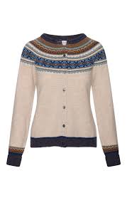 This design is a contemporary take on the Scottish fairisle yoke pattern with a small rib hem around the hip. Above the long rib cuffs is small pattern detailing mimicking a bracelet. Our colours take months to prepare and each year we offer new colourways. The cardigan is front opening and lined with grosgrain ribbon to hold the mother of pearl shell buttons. The cuffs are extra-long for extra warmth or to fit longer arms.