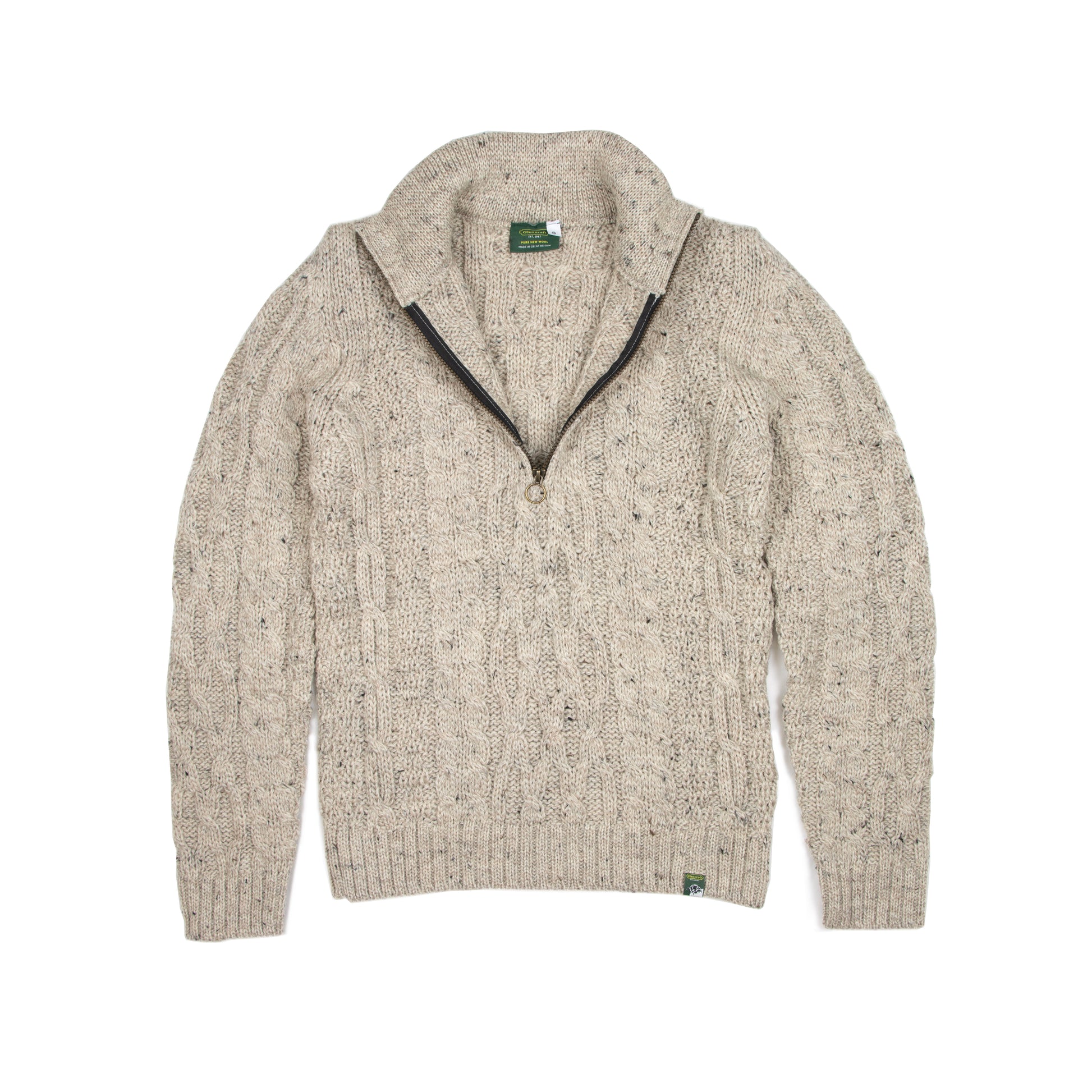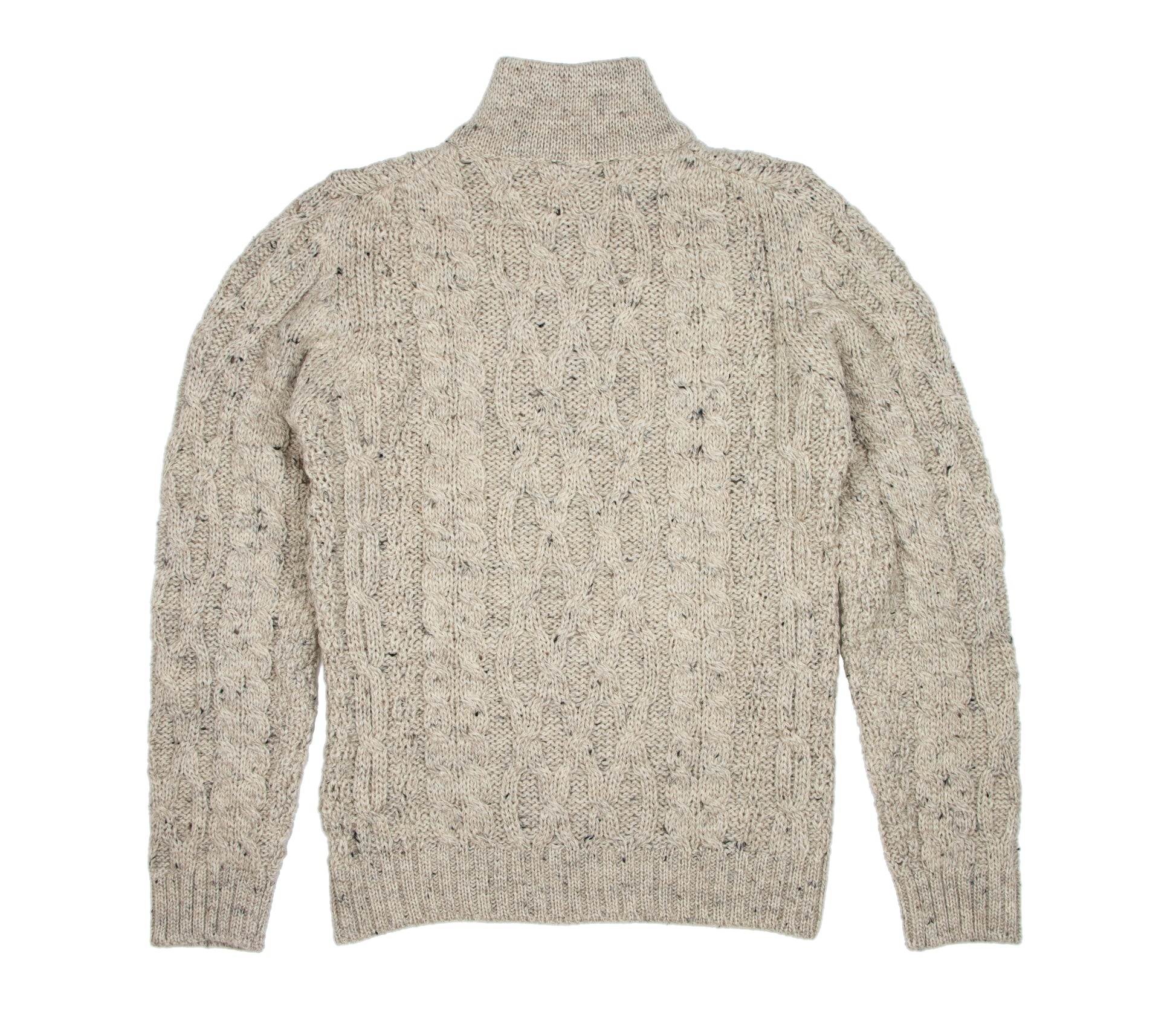 A chunky Aran jumper knitted in the North of England from a creamy beige flecked British Wool yarn. It features a zip up shawl neck collar to keep the cold wind at bay.