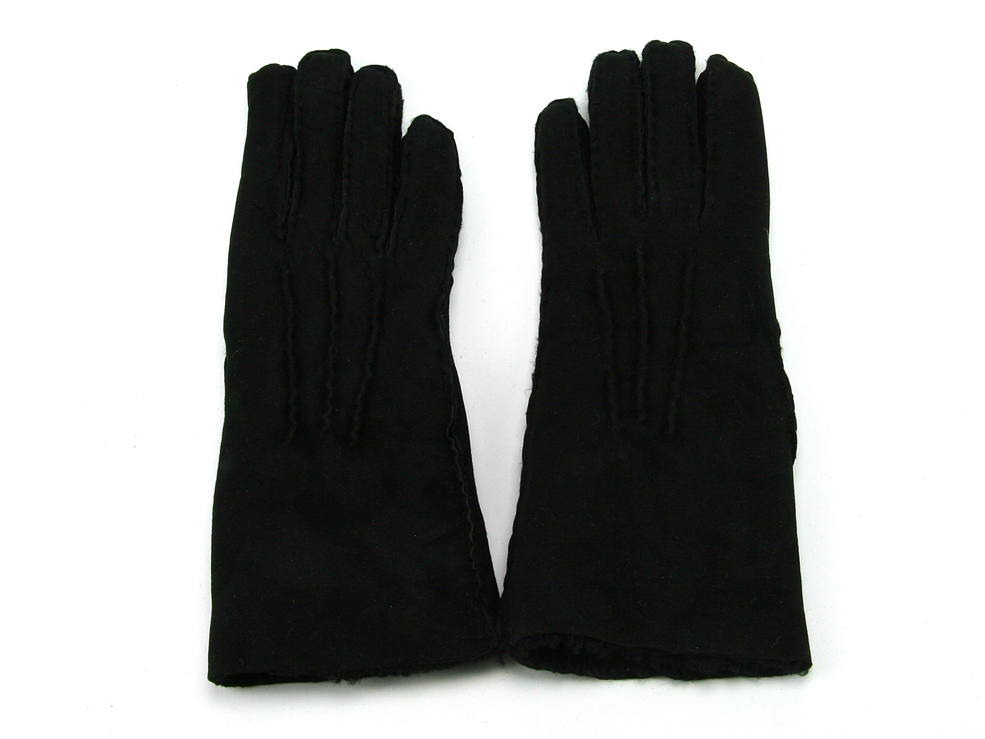 The gloves are wrist length and are usually worn with no cuff but the wrist can be turned up if required to create a fluffy cuff. They feature three 'points' - the sewn wiggly ridges on the back of the gloves.
