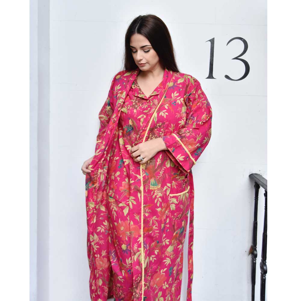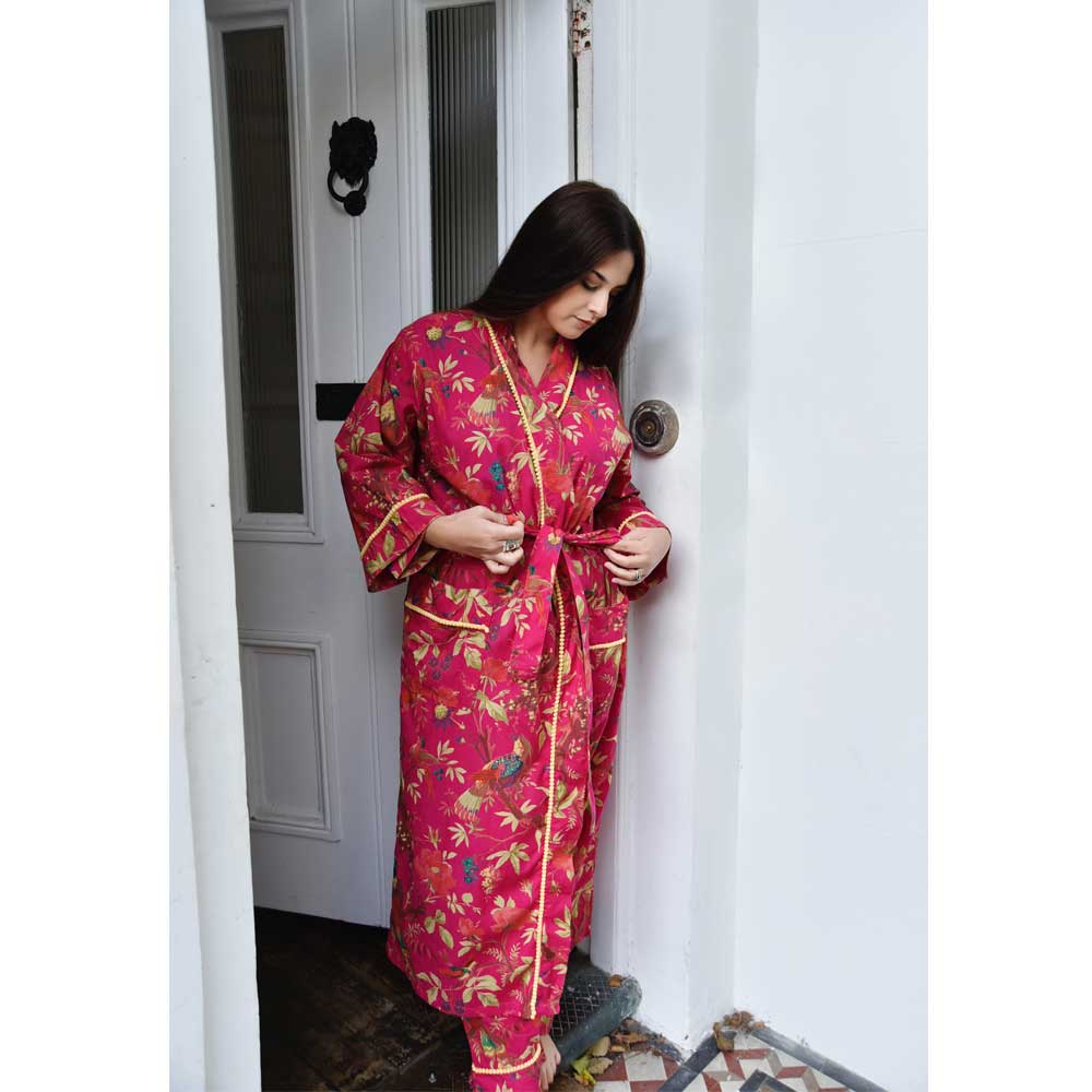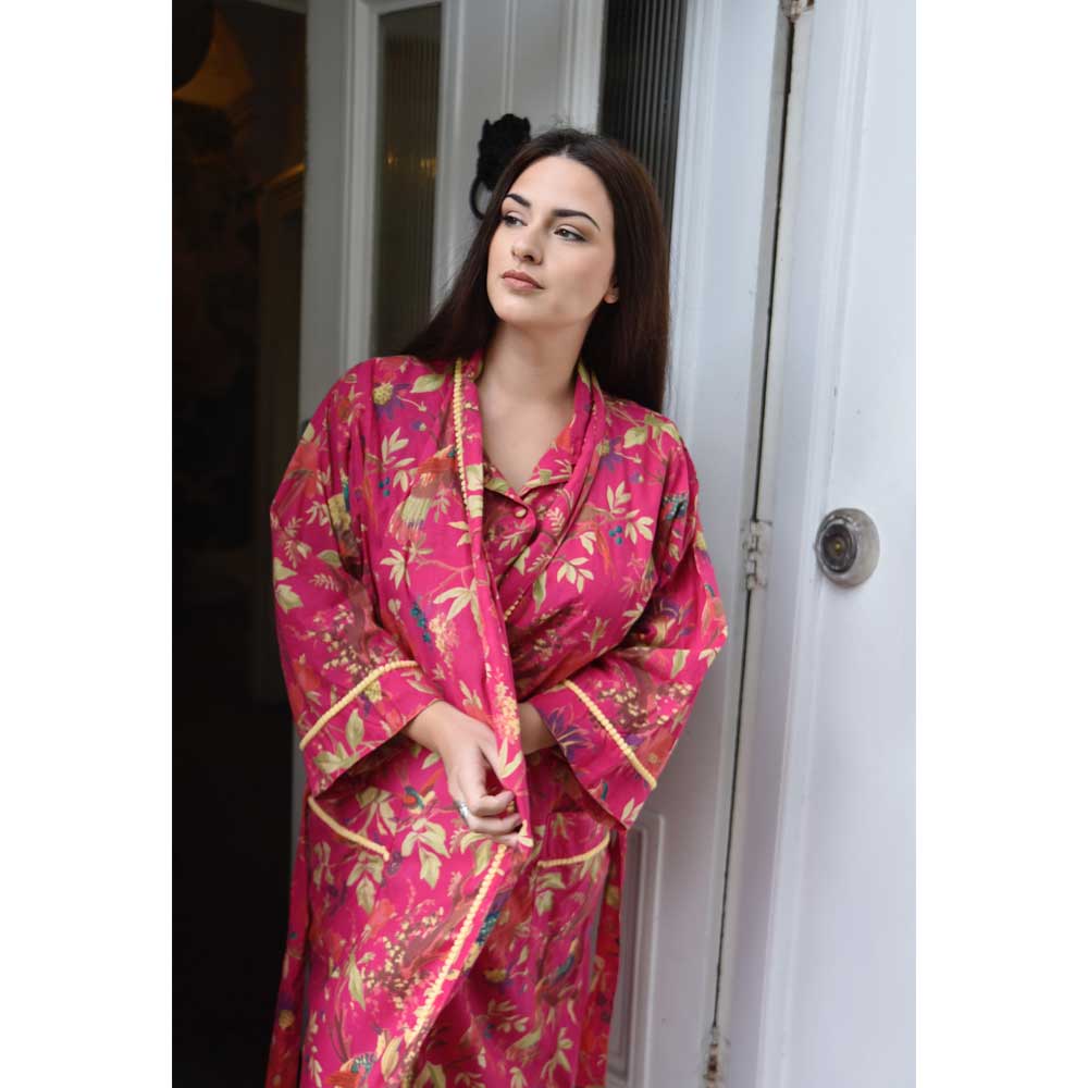 This dressing gown is in a vibrant Chinoiserie-inspired print which features multi-coloured birds sitting on branches laden with exotic flowers against a hot pink background. The print is accented with a lemon pom-pom edging on the open front, cuffs, and pockets. It ties with a matching long belt.
