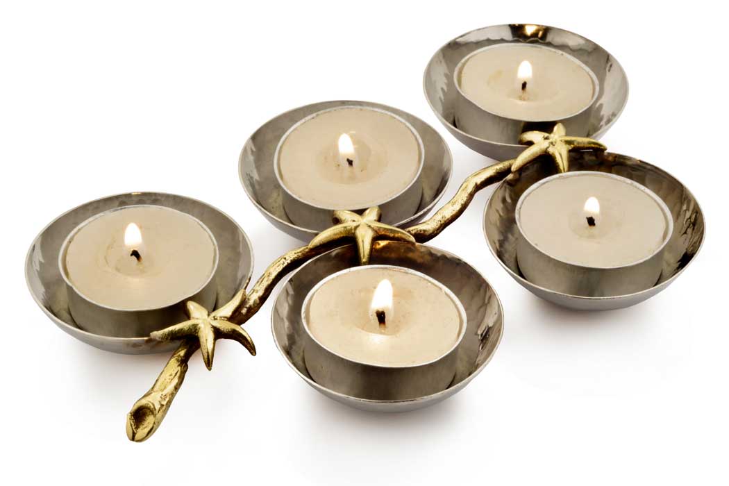 Stainless steel pinch bowl sets in a light hammer finish, interlinked with brass leaves and presented in a stylish gift box.